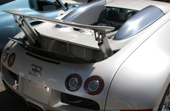 A tail wing on the back of a sports car. The Bugatti Veyron® tail wing rises to generate more downforce at high speeds. Image in the public domain, via Wikimedia Commons.